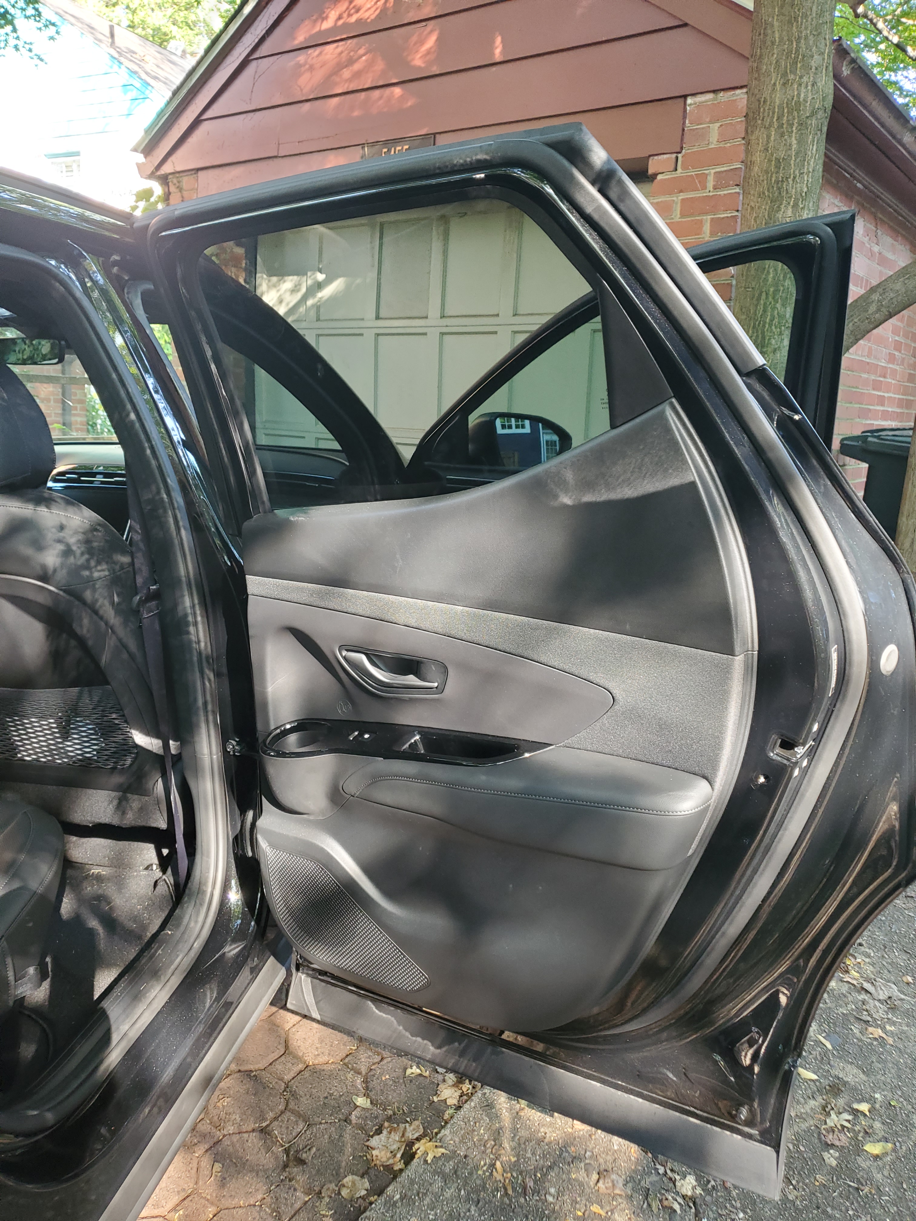 Leather-trimmed seats are comfortable but not super comfortable for long-distance road trips, they could use a little more firmness and support. The rear seating area provides adequate leg and knee room, maybe not super large guys, but for kids and smaller adults it will be fine for short trips. One passenger described the rear as cavern-like with the smaller window space and the black interior. Rear cup holders for the outboard seats are in the door panel,. This model did offer a sliding metal panel sunroof opens to provide more light, though it is only over the front seats.
