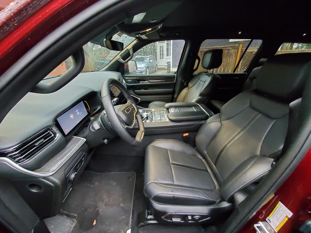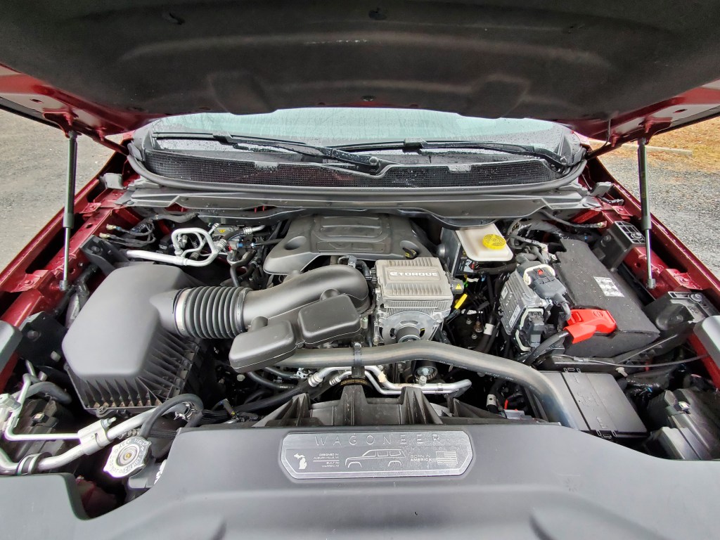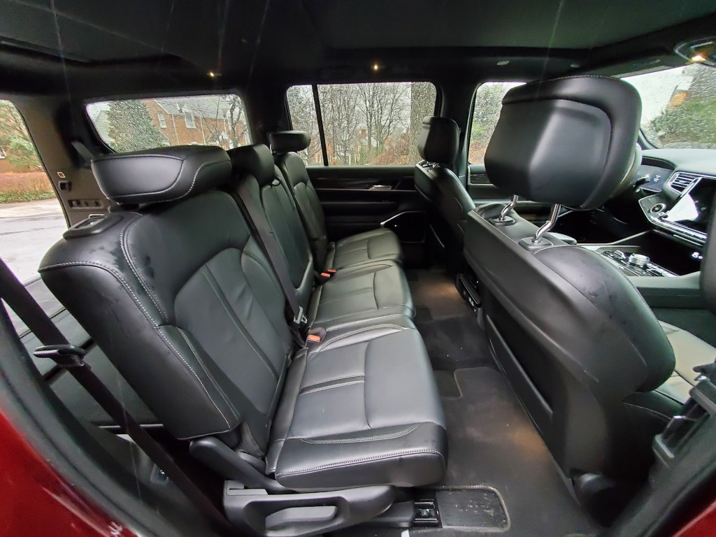 It is a Jeep, after all, even if it does not say JEEP blatantly on the exterior, though there are plenty of Jeep word logos in the lights and Jeep easter eggs around the vehicle. The 5.7 V-8 Engine features e-Torque as well as cylinder de-activation, providing power, performance, and economy. Well as much economy as you can expect for a vehicle of this size. I( never saw much over 21 miles per gallon. Also, you can equip the Wagoneer with Quadra Drive III which is Jeep’s intelligent all-wheel-drive system that puts the power to the wheels that have grip, and does not spin those wheels that do not have traction.