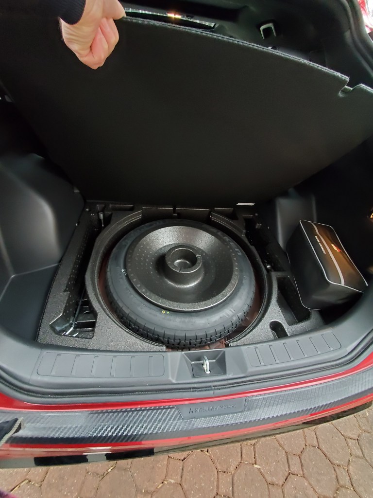 The body-color door handles, distinctive side moldings, and wheel arches stand out. The tall side profile belies its low step-in height; while it is not low to the ground, you do not need a step stool to get into it. On the other hand, the high door sill means you have to swing your feet a bit higher than one might expect. The Eclipse Cross has LED headlamps, fog lamps and daytime running lamps and LED tail lamps, high mount rear stoplight. This SEL model Mitsubishi sent us came with two-tone eighteen-inch wheels and tires. And surprise, a temporary large doughnut spare tire nestled inside the car under the rear cargo floor, along with a jack and tools. Speaking of tools, with the $295 Popular Value Package, which this Eclipse Cross has, you get a Roadside assistance kit. Most people will call roadside assistance, so I doubt this will ever be used, but it is adorable with some great tools. And as part of the $190 Welcome Package, you get a touch-up paint pen for this optional $595 Red Diamond Paint.