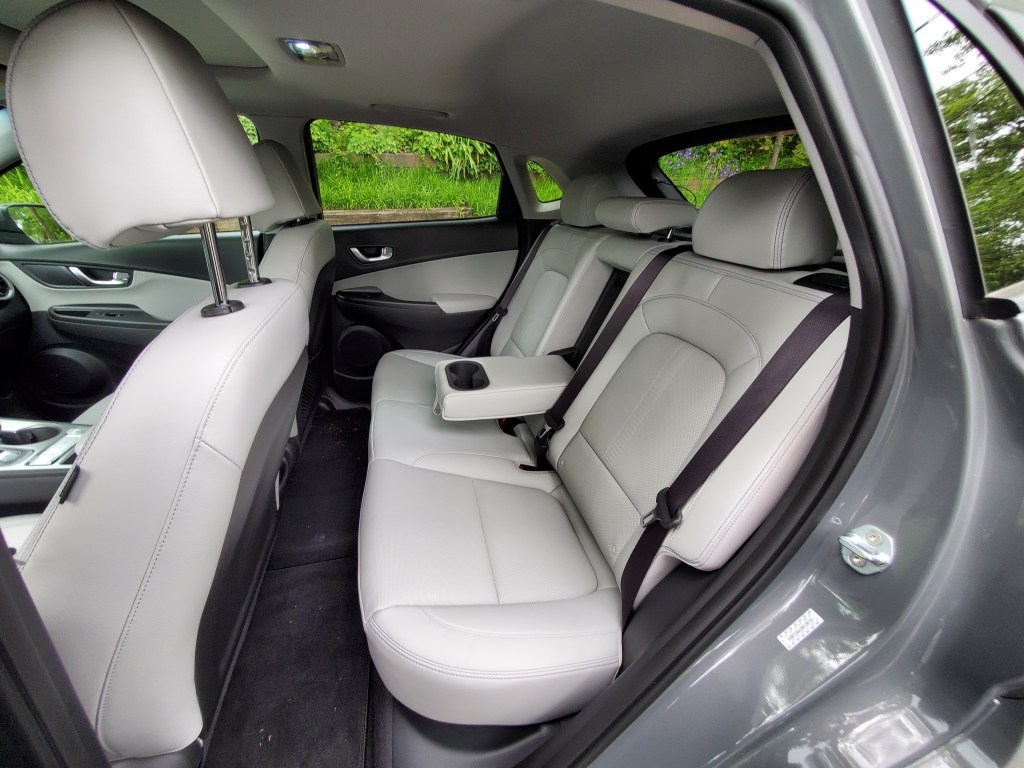 The cargo area is limited to 19.2 square feet as this hatchback is designed primarily for passengers, though there is a small amount. With the rear seats down, it expands to 45.8 square feet, though we found it just shy to place a six-foot ladder in the vehicle, which involves moving the right front seat forward and placing the back all the way forward. The Kona does not have a frunk, which has become popular in some other electric vehicles, which for us is just fine. A frunk means a trunk under the front hood and thus moves more of the mechanicals into an area that could be used as passenger space.