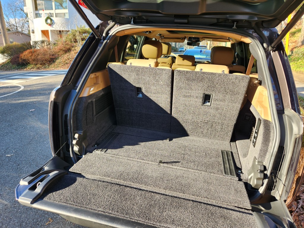 The second and third tow seats also feature a lot of luxuries; the 2nd-row can recline, and each rear door switch to control the sunshade on the glass roof and side door privacy shades. Which may become great fun for kids as they taunt their seatmates. The third row is surprisingly comfortable as it is heated and features plenty of cubby spaces as well as power outlets. Even with the 3rd-row seat in place, there is still plenty of cargo room. And with that third row down, there is a lot of space, which opens up even more with the 60/40 2nd-row seats available to be folded down independently.